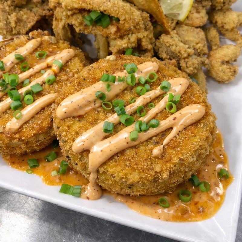 Fried golden brown, served on a bed of seasoned rice and our remoulade sauce